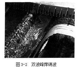 印制板繼續(xù)向前運(yùn)行,印制板的底面首先通過第一個(gè)熔融的焊料波。第一個(gè)焊料波是亂波(振動(dòng)波或紊流波),將焊料打到印制板的底面所有的焊盤、元器件焊端和引腳上;熔融的焊料在經(jīng)過焊劑凈化的金屬表面上進(jìn)行浸潤和擴(kuò)散。之后,印制板的底面通過第二個(gè)熔融的焊料波,第二個(gè)焊料波是平滑波,平滑波將引腳及焊端之間的連橋分開,并去除拉尖(冰柱)等焊接缺陷(圖3-2是雙波峰焊錫波)