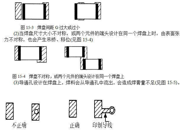 (2)焊盤間足L—確保元件端頭或引腳與焊盤哈當?shù)拇罱映叽?。焊盤間距過大或過小都會引起焊接缺陷;(見圖15—1)。