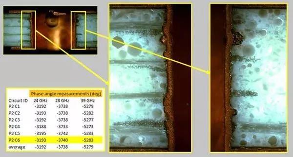 圖7.RO4730G3材料的從頂層到底層線路的金屬化過孔孔壁(較為粗糙)的表面特征和3個毫米波頻率下相位測量結(jié)果。