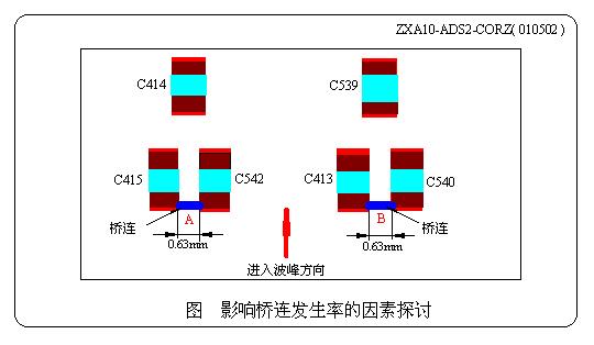 在上講中我們給出了一個討論題:C線在焊接工號為:ZXA10-ADS2-CORZ( 010502 )時,基板上電容C415與C542、C413 與C540之間相鄰間隙均為0.63mm( <1.27mm,屬于設(shè)計不當),用新噴嘴開雙波時在圖2所示的A、B二處百分之百地發(fā)生橋連現(xiàn)象,而僅開第二波進行單波焊接時,反而橋連發(fā)生率卻非常小。其實問題就出在助焊劑上,主要原因不外乎是: