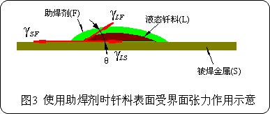 焊接中使用助焊劑可以清除釬料和被焊金屬表面的氧化膜,改善了潤濕。而且當液態(tài)釬料和被焊金屬表面復蓋了一層助焊劑之后,它們之間的界面張力發(fā)生了變化,如圖3所示。